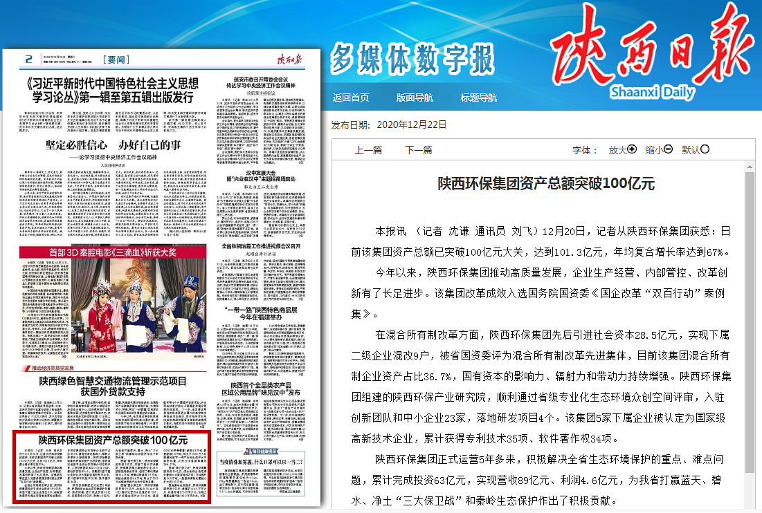 陜西環(huán)保集團(tuán)資產(chǎn)總額突破100億元