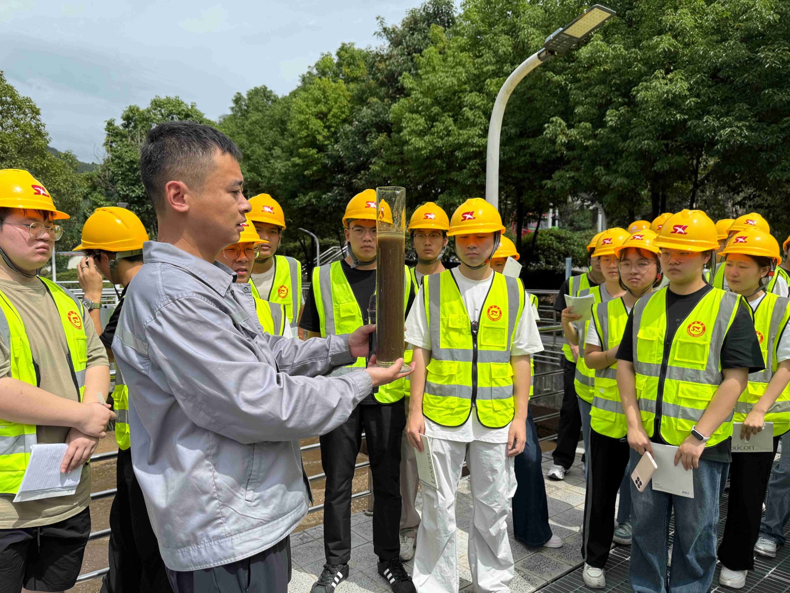 活動(dòng)現(xiàn)場(chǎng),工作人員首先向師生們介紹了污水處理廠的概況及運(yùn)行情況,隨后,帶領(lǐng)大家依次參觀細(xì)格柵、生化池、消毒池、出水口等污水處理設(shè)施,系統(tǒng)講解污水從收集、處理到達(dá)標(biāo)排放的全流程工藝。在互動(dòng)問(wèn)答環(huán)節(jié)中,現(xiàn)場(chǎng)工作人員針對(duì)污泥處置、水質(zhì)監(jiān)測(cè)等問(wèn)題進(jìn)行專業(yè)講解,并通過(guò)現(xiàn)場(chǎng)陳列處理前后的水樣對(duì)比,讓師生們直觀見證污水處理成效,深化環(huán)保知識(shí)認(rèn)知。